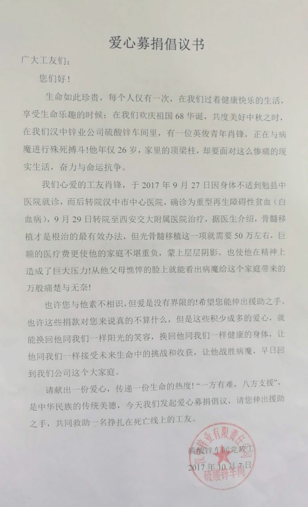 肖鋒,陜西勉縣同溝寺人,20164月14日到漢中鋅業硫酸鋅車間工作,2017年元月轉為公司協議工。2017927日,肖鋒經漢中市中心醫院確診為重型再生障礙性貧血(白血病),轉院至西安交通大學附屬醫院住院治療。骨髓移植才是根治的最有效辦法,才能挽救肖鋒的生命!突如其來的噩耗和籌借巨額的醫療費用讓一個普通的農民家庭悲痛欲絕……