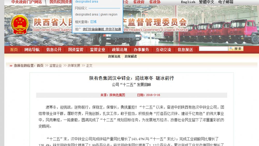 《中國有色金屬》雜志 陜西國資委網站:迎戰寒冬 破冰前行——漢中鋅業公司“十二五”回眸