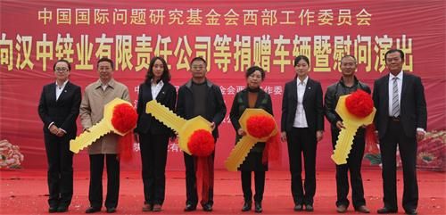 11月12日上午,中國國際問題研究基金會西部工作委員會向陜西鋅業、五洲礦業、煎茶嶺鎳業及我公司捐贈救護用車儀式在公司隆重舉行。中國國際問題研究基金會副理事長、西部工作委員會主任時進龍,陜西有色集團工會主席秦西社及公司董事長劉朝斌、總經理侯小強出席儀式。陜西鋅業工會主席李珍珠、五洲礦業工會主席余文遠、煎茶領鎳業黨委書記楊宏信及公司工會主席李永代表各自企業接受了捐贈。