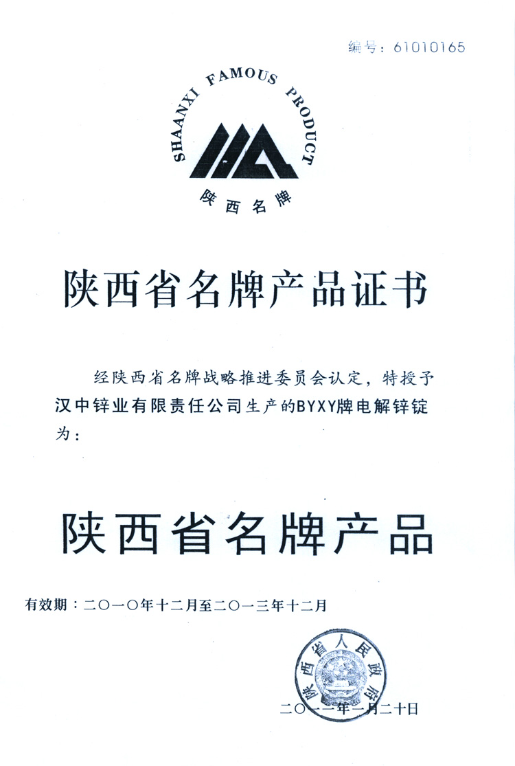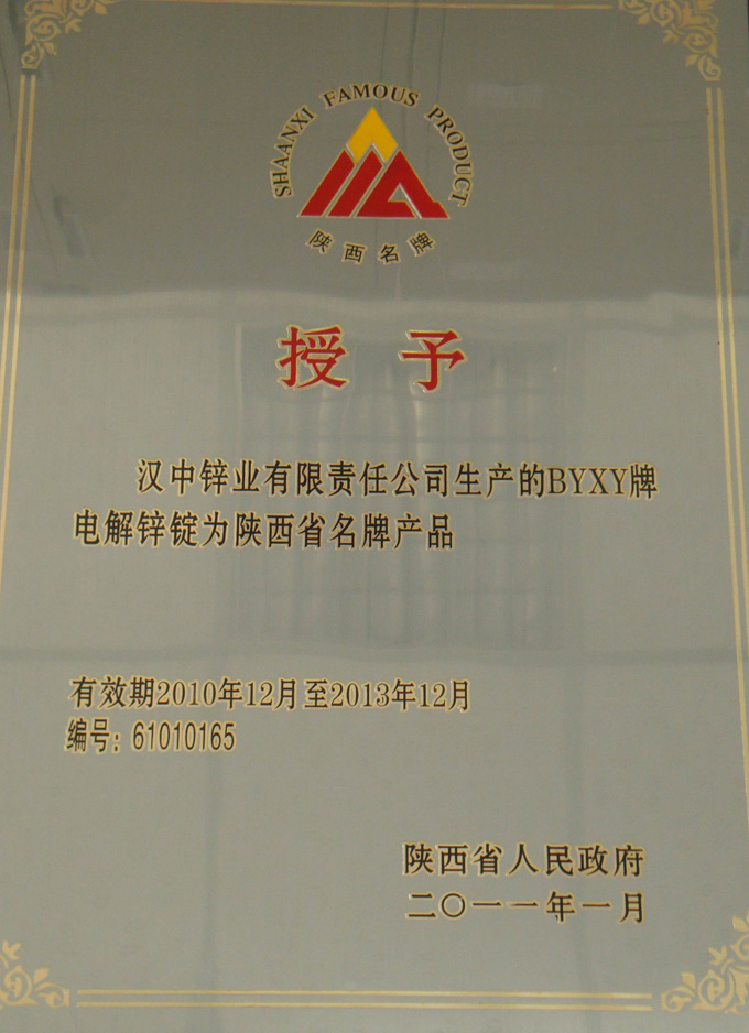 2011年1月,公司生產的BYXY牌電解鋅錠再次榮獲陜西省“名牌產品”稱號 -